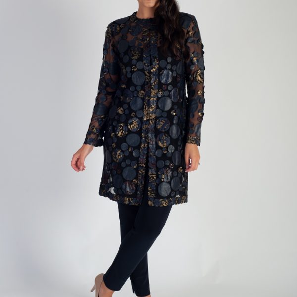 Navy/Gold Print & Plain Irregular Spot Applique Leather On Mesh Coat –