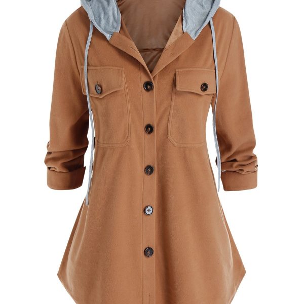 Plus Size Dual Pocket Hooded Button Front Curved Hem Coat