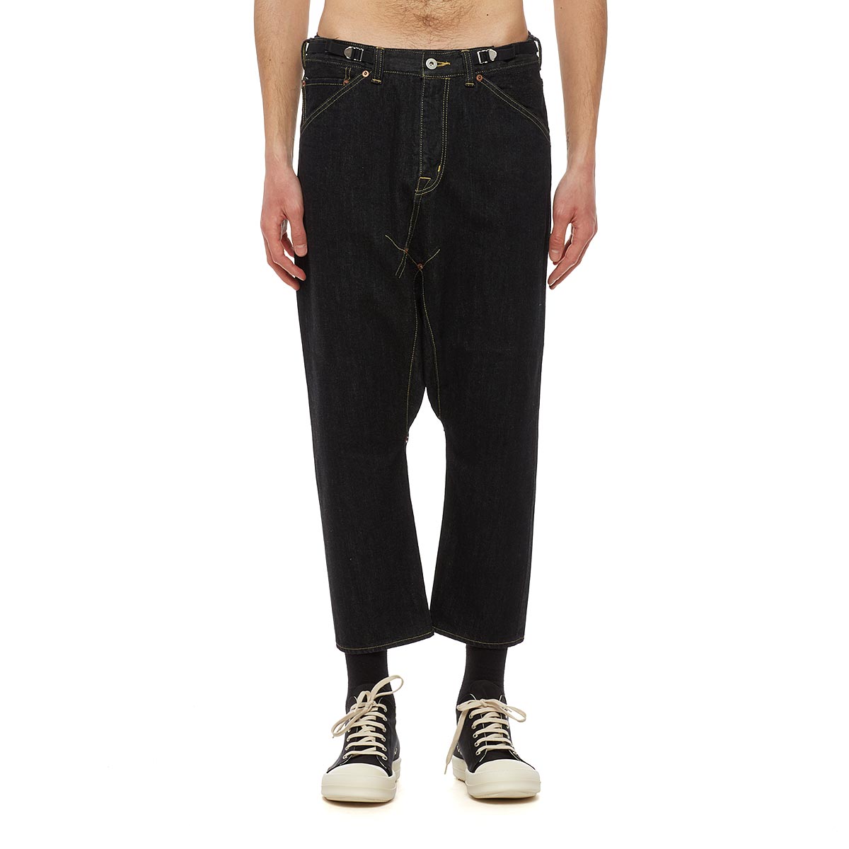 Low crotch denim pants from the S/S2017 Ganryu collection in blackThese denim pants from Comme des Garçons Ganryu new collection comes in an oversized fit. The low crotch trousers, here in black denim, are made of cotton and features five pockets, an adjustable waistband from the inside and a zip and button closure. – Low crotch pants- Five pockets- Adjustable waistband- Composition: 100% Cotton- Made in Japan – Code: ES-P020-051-1- The model is wearing an international S size
