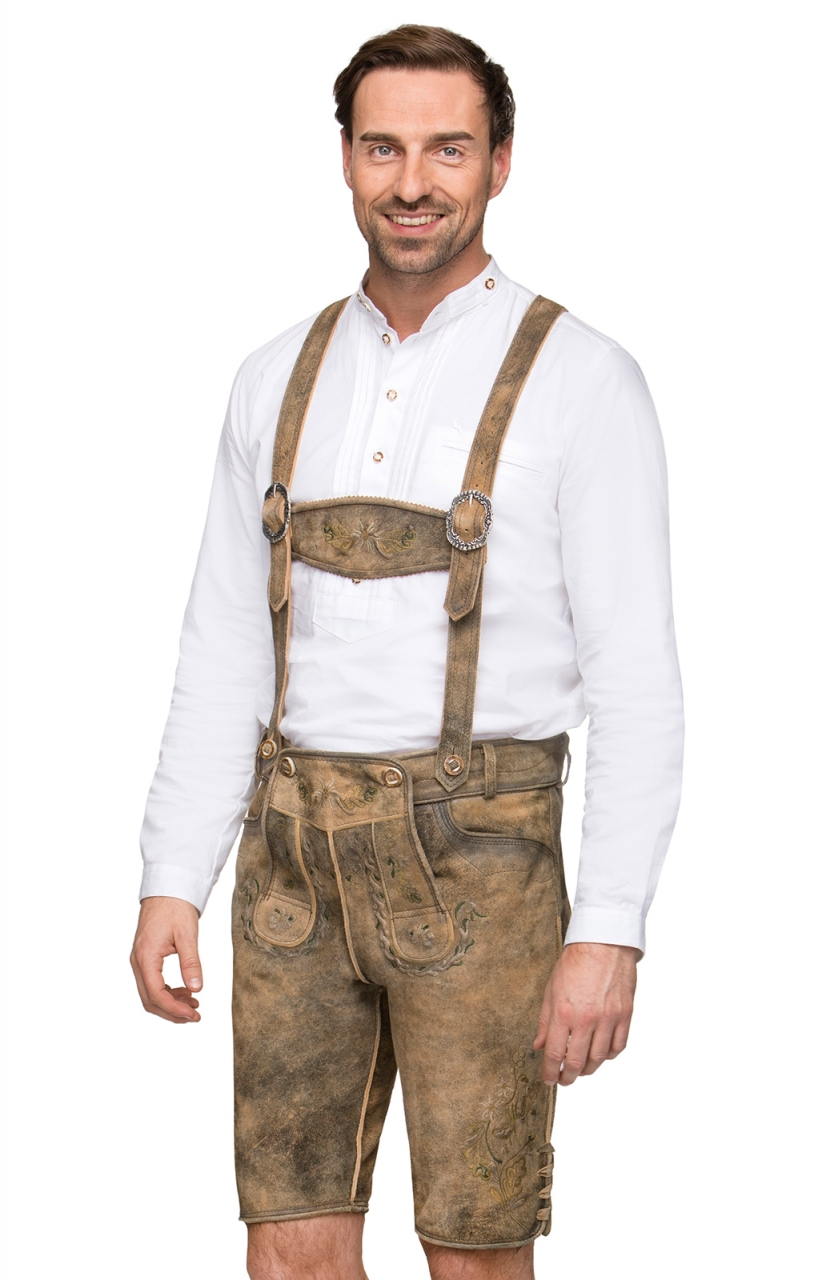Short Trachten Lederhosen Fesl in Hemp. The high-quality Fesl Trachten Lederhosen are made from soft, weathered leather in a subtle shade of hemp. Fesl Lederhosen are supplied with detachable and adjustable braces in the classic H-shape but belt loops are also provided for a different look. These Lederhosen are lavishly embroidered with edelweiss flowers and other traditional motifs in tones of green, gold and white. Horn buttons accentuate the front flap and waistband and soft leather ties are used to adjust the back waist and to add detail to the hems. Perfect for an everyday rustic look or to impress at the Oktoberfest!