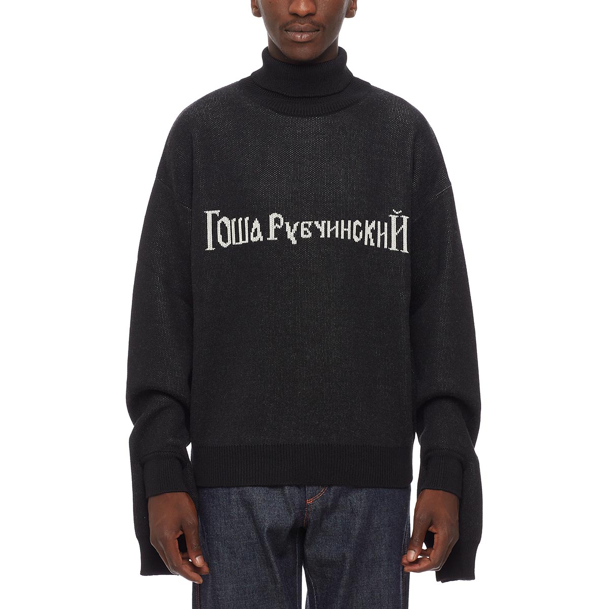 Double cuff sweater from the F/W2016-17 Gosha Rubchinskiy collection in blackThis sweater from Gosha Rubchinskiy new collection comes in an oversized fit. The sweater, here in black, is made of wool and features a turtleneck, double cuff and Gosha Rubchinskiy logo at front.- Double cuff sweater- Turtleneck- Gosha Rubchinskiy logo- Composition: 50% Wool – 50% Acrylic- Made in Italy- Code: G009N002 A- The model is wearing an international M size