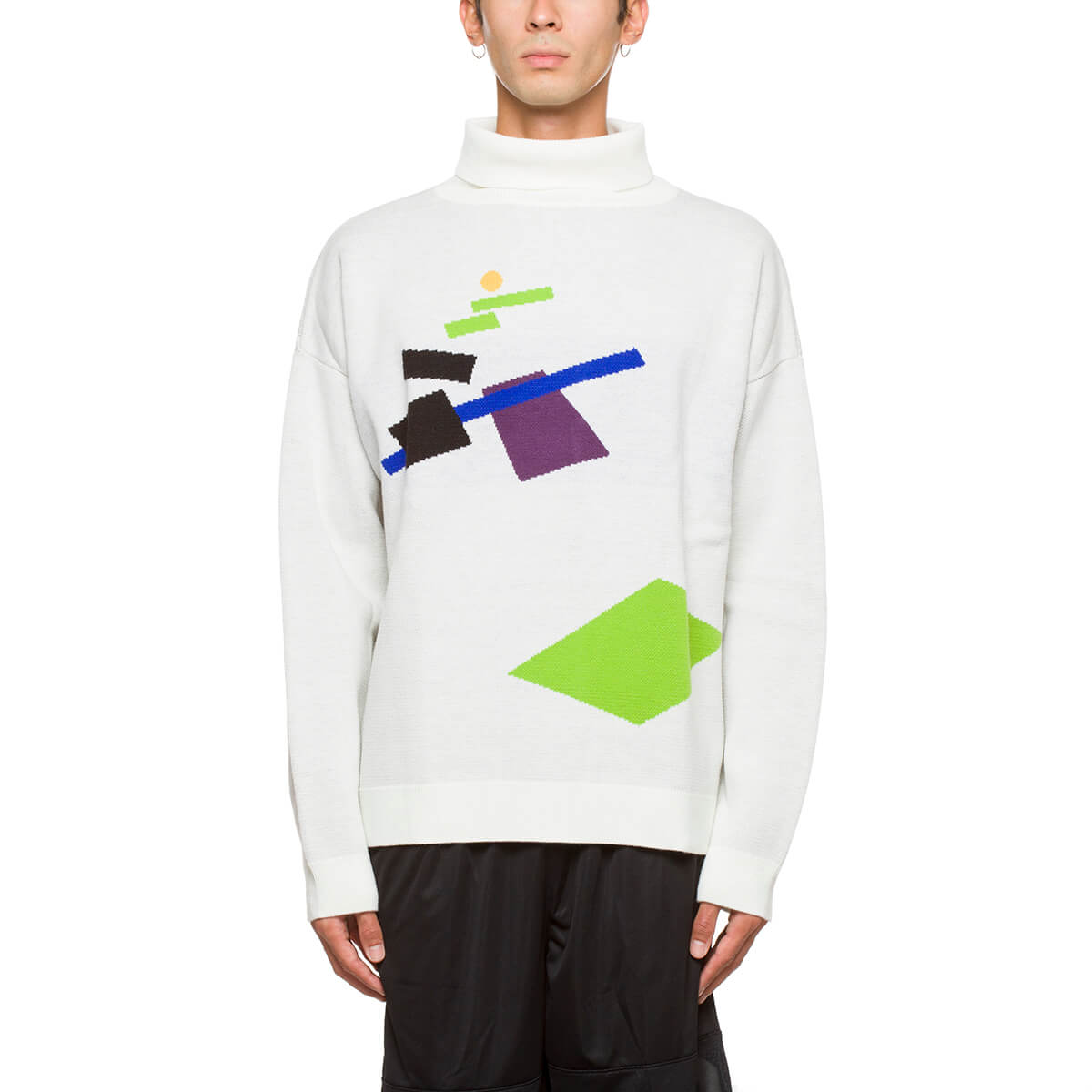 Geometry sweater from the F/W2017-18 Gosha Rubchinskiy collection in whiteThis sweater from Gosha Rubchinskiy new collection comes in a comfortable fit. The turtle neck sweater, here in white, is made of wool and features a graphic at front.- Turtle neck sweater- Graphic at front- Composition: 50% Wool 50% Acrylic – Made in Spain- Code: G011N004 C- The model is wearing an international L size