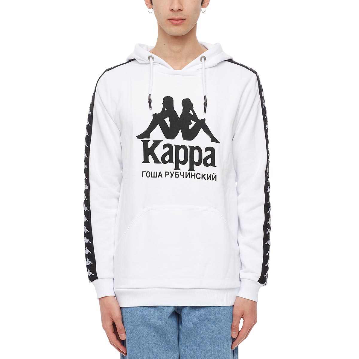 Kappa hoodie from the S/S2017 Gosha Rubchinskiy collection in whiteThis hoodie from Gosha Rubchinskiy new collection comes in a regular fit. The hooded sweatshirt, here in white, is made of cotton and features a wide kangaroo pocket and also Kappa and Gosha Rubchinksiy logos.- Hoodie- Pocket- Kappa logo- Gosha Rubchinskiy logo- Composition: 80% Cotton – 20% Polyester – Made in Turkey- Code: G010T304 D- The model is wearing an international L size